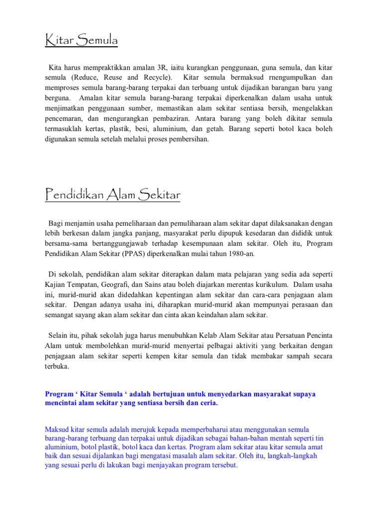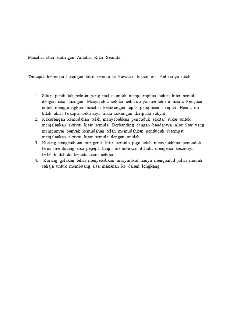 Masyarakat sekitar seharusnya memahami hasrat kerajaan untuk mengurangkan masalah kekurangan tapak pelupusan. View masalah kitar semuladocx from sdk 12 at sekolah menengah king george v. Pada masa kini konsep kitar semula ini kurang diterapkan dalam diri masyarakat kerana masyarakat pada hari ini lebih mengamalkan sikap tidak menghiraukan alam sekitar.